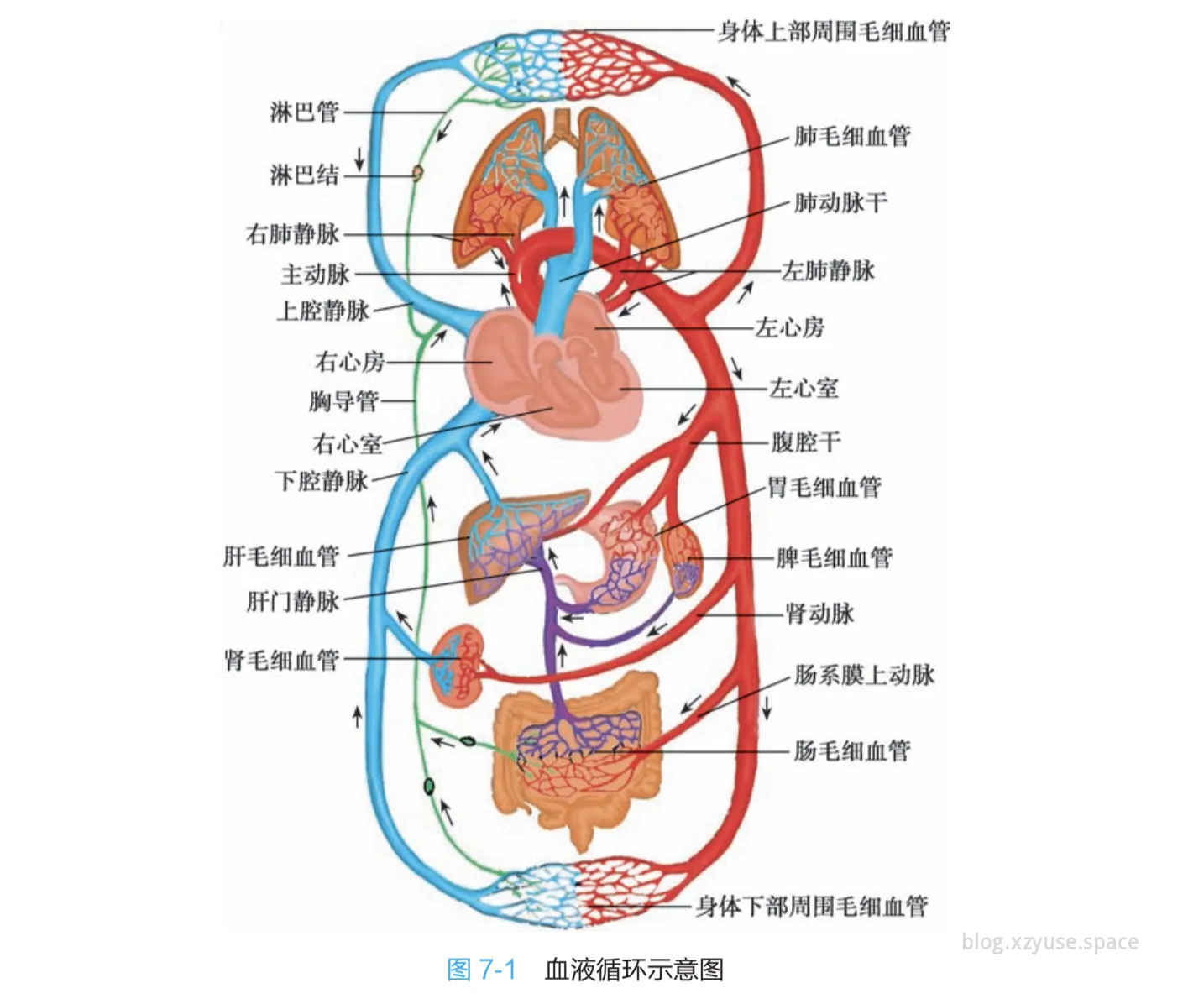 首先从整体的角度看,这有助于我们了解心脏在脉搏管系统中的重要地位(心脏是脉管系统,血液循环的中心枢纽)。下面这张图其实我一点也不陌生,这张图最早出现在初中生物教材中,当是我们的生物老师还仔细介绍了大循环和小循环,但是当时生物并不是必考课,所以也是十分的懈怠,完全不知道大循环(体循环)和小循环(肺循环)的区别就是了。