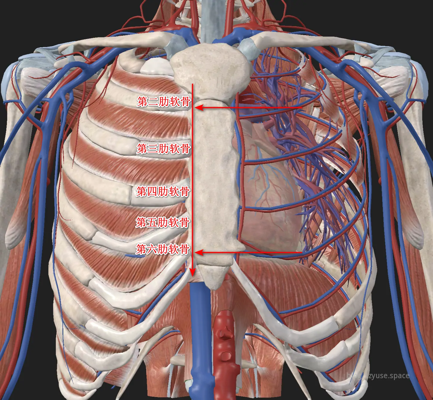 中国成年男人心脏重量约 284g±50g,成年女人心脏重量约258±49g,心脏的 2/3 位于正中线的左侧,心脏的 1/3 位于正中线的右侧,前方平对2-6肋软骨(这个比较重要,心脏查体要用到),后方平对 5-8 胸椎。心的长轴自右肩斜向左肋下区,与身体正中线呈现45°角。
