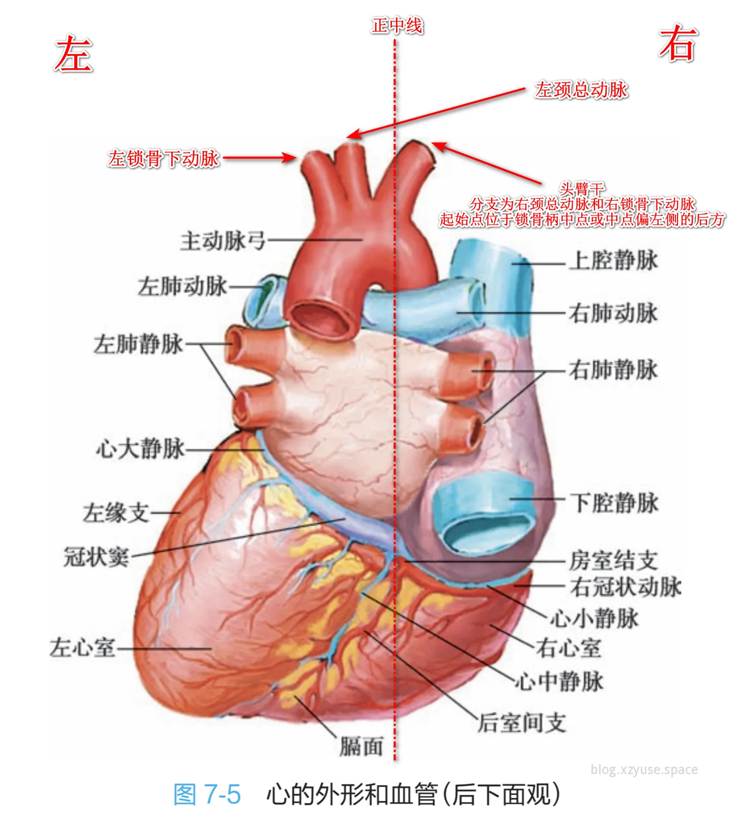 然后就是左边的那幅图(也就是心脏的后面观),你还能发现一个好玩的东西,后面观中你可以看到主动脉和肺动脉挤在左上方,肺静脉和上下腔静脉则是在右下方。我对这个比较敏感,具体说明原因,其实我也不清楚,就是莫名其妙的敏感,也许涉及到思考模式了吧。