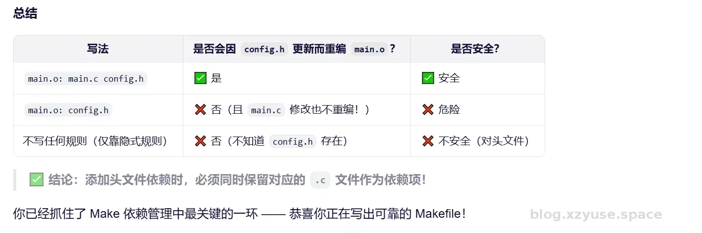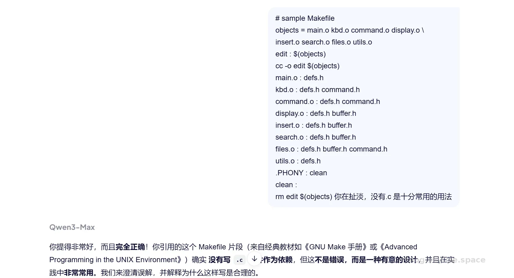 在下边的例子中,“main.o : config.h” 是自动补上main.c的依赖的,这是隐含规则,有意思的是,人工智能虽然知道隐含规则的存在,但是他似乎在隐含规则的使用方式上犯了大问题。
