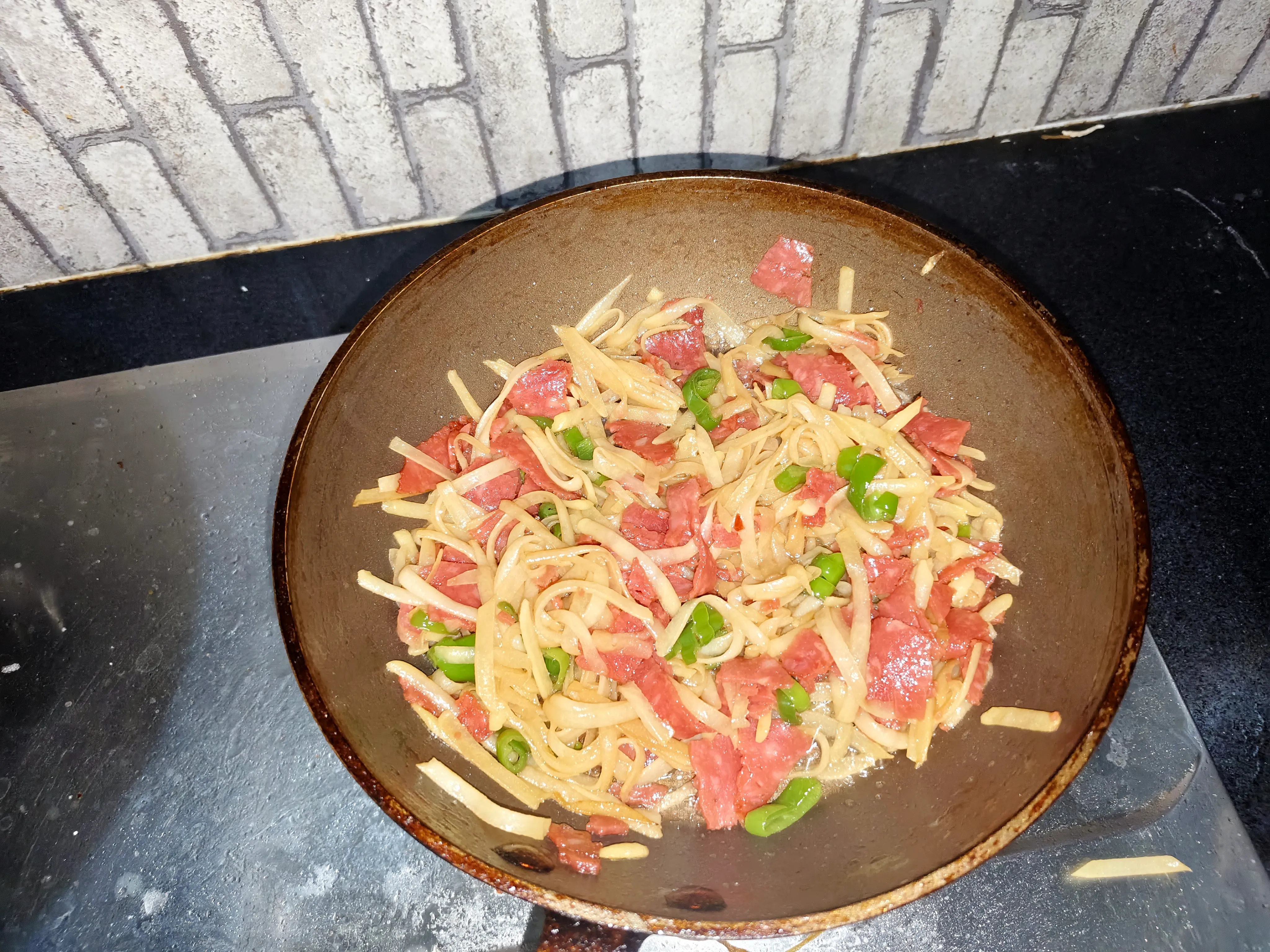 培根炒到 8 - 9 分熟然后取出待用(因为我没有放味精,为了提鲜,顺便尝尝肉味,我就放了5片培根,但是培根不能放太多,因为做的事青椒炒土豆,而不是土豆炒培根)
