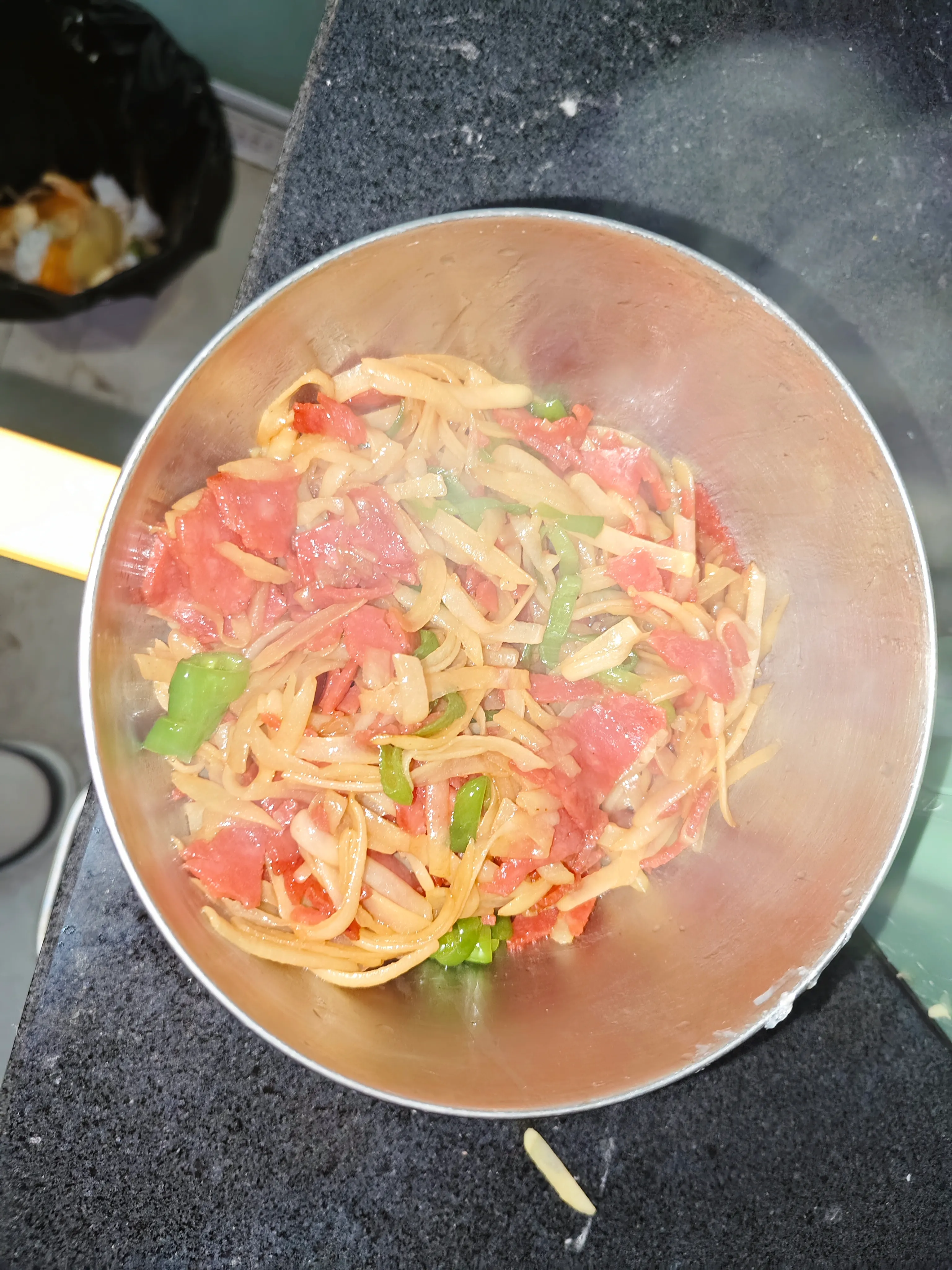 青椒切成丝,但是不要放太多,无需弄熟,备用。