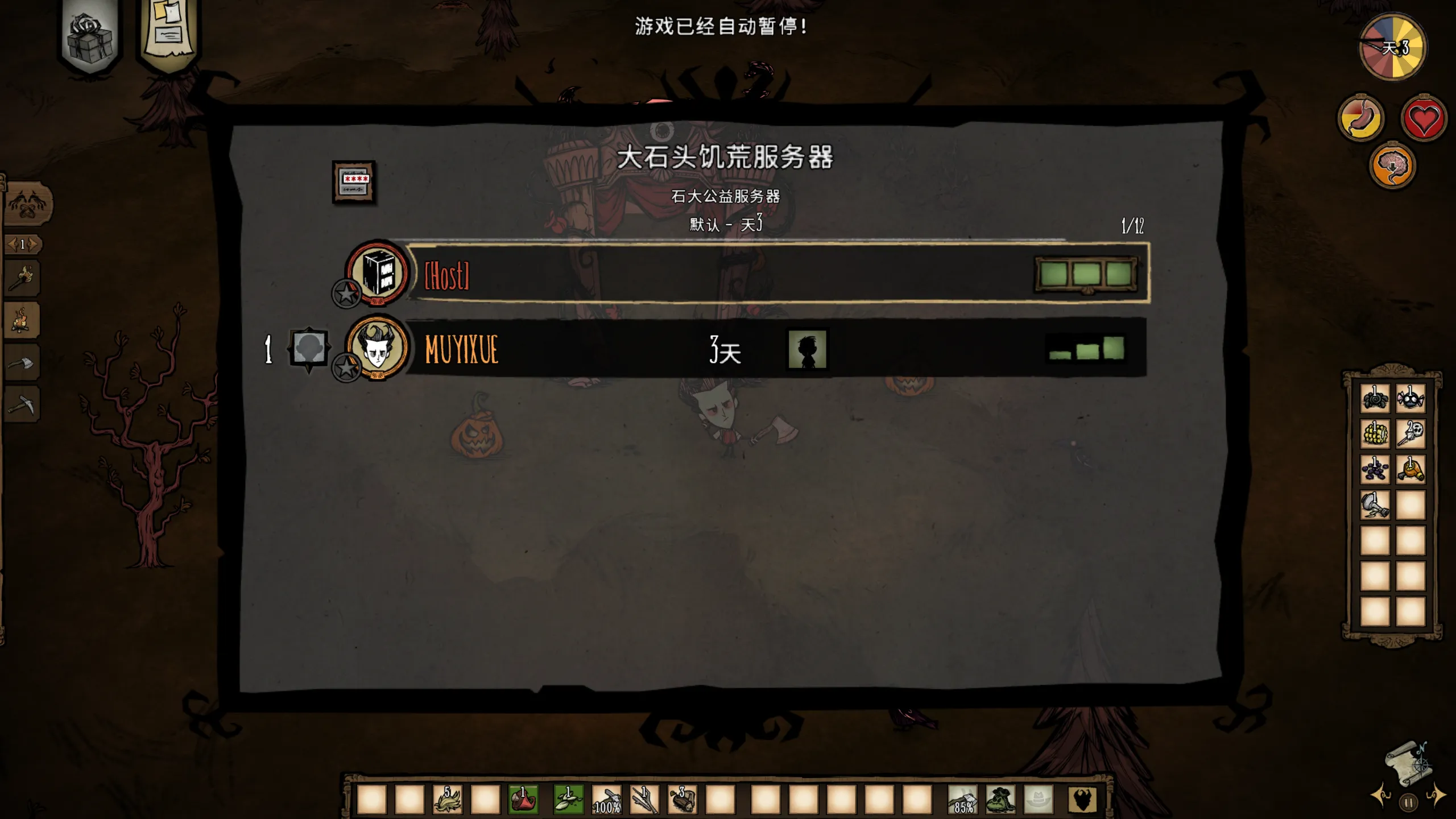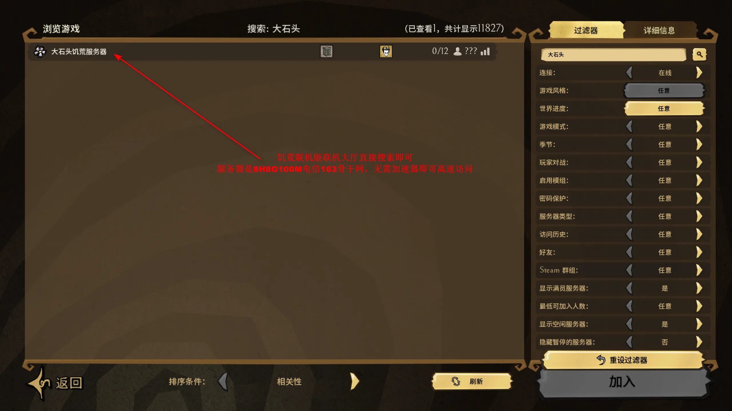 因为服务器是共享带宽,但是母鸡的带宽分配算法似乎存在问题,如果长期不占用带宽,需要等待一段时间才可以以比较合适的速度传文件,所以我打算部署一个可以保活的服务,为了让博客的加载体验更好,我分出了4G母鸡空间用于搭建饥荒服务器,不设密码,免费使用,如果想要使用的随意使用即可。
