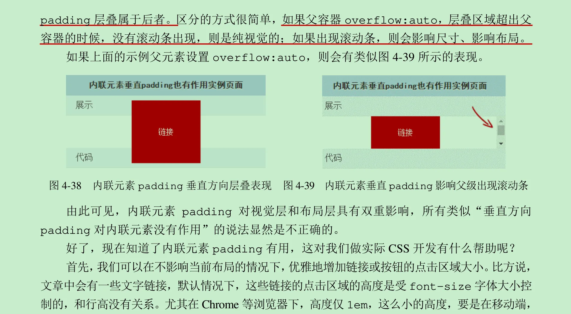 这本书是阅文集团的15年前端写的 , 书籍出版于17年 , 直接就指明了当前广泛的认知错误,而这个错误在23录制的补习班课程还在使用 : 行类元素的pading 在垂直方向上不影响布局但是影响视图- 是错误的,不仅仅影响布局,也影响视图,好笑的是,我之前看CSS基础课的时候,还听到了尚学堂那个老师说的这个只影响视图.我还深以为然,确实,在他的示例中,就是看不见布局的变化,其实只是由于行框(line box)的高度由 line-height 和内容决定,padding 不参与行高计算,所以看起来“没变化”,不等于“不影响布局”.